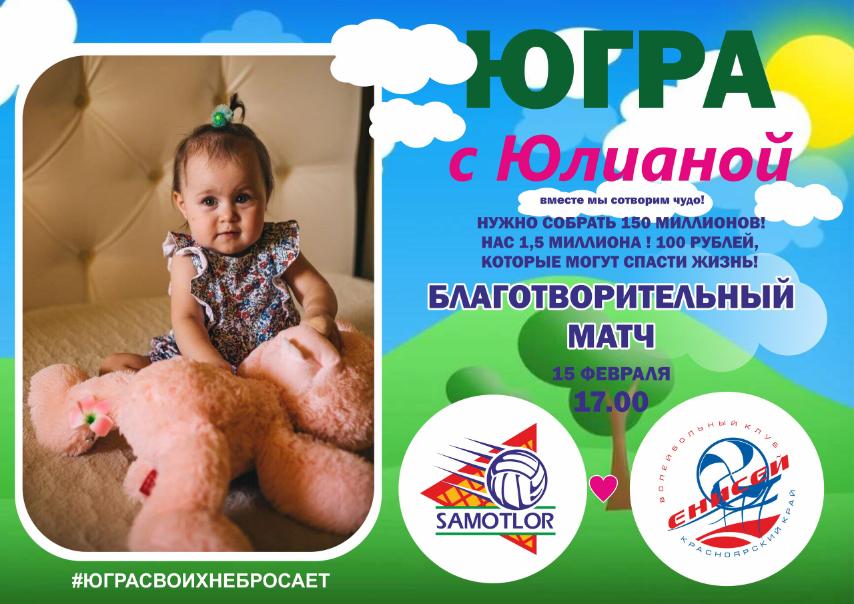 «Югра-Самотлор» проведёт два благотворительных матча в поддержку Юлианы Сырцевой. Все средства, вырученные от продажи билетов на игры с «Енисеем» (15 февраля) и «Новой» (21 февраля), поступят в фонд помощи девочке Маленькой жительнице Югорска требуется дорогостоящее лечение от тяжёлого генетического заболевания, которое приводит к постепенной атрофии… Подробнее »Югра с Юлианой
